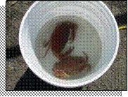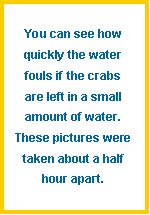 The most important thing to know about keeping crabs alive is that they need oxygen and suffer in dirty water. The pics to the right show how quickly a standard bucket can become cloudy with the crabs’ own filth. These pictures were taken maybe half hour to an hour apart. We discovered that crabs actually don’t need to be immersed in water to live, which is a good thing since they foul water very quickly! Keep your crabs in a clean bucket of water while you’re on the dock, then transfer to the crab carrier after a couple hours, or when you’re ready to leave. To make our live crab carrier you need: * Ice chest Fill the plastic bottles approximately 3/4 full with water (to allow for expansion) and freeze. Lay the bottles in the bottom of the ice chest—you don’t need a fully covered bottom, but do need sufficient bottles to keep the chest cool. Take the dry bath towel and place over the bottles in such a way that the crabs can’t touch them directly. This provides a cool, but not frozen surface for the crabs to be on. If the crabs are laid directly on ice, they can freeze to death. Once you begin loading your crabs into the ice chest, wet and crumple up some newspaper to lay and loosely pack around the crabs. Don’t pack tightly! The newspaper will also act as a tactile shield to stop them from fighting. It’s very important to leave the ice chest open a crack for air. We usually use the corner of the towel to keep the lid open about an inch. We have begun crabbing at 8 or 9 in the morning and kept our first catches alive until 8 or 9pm when we finally returned home. After you take them out of the ice chest, they will warm up and start moving or walking around. If they don’t move—don’t eat them! |